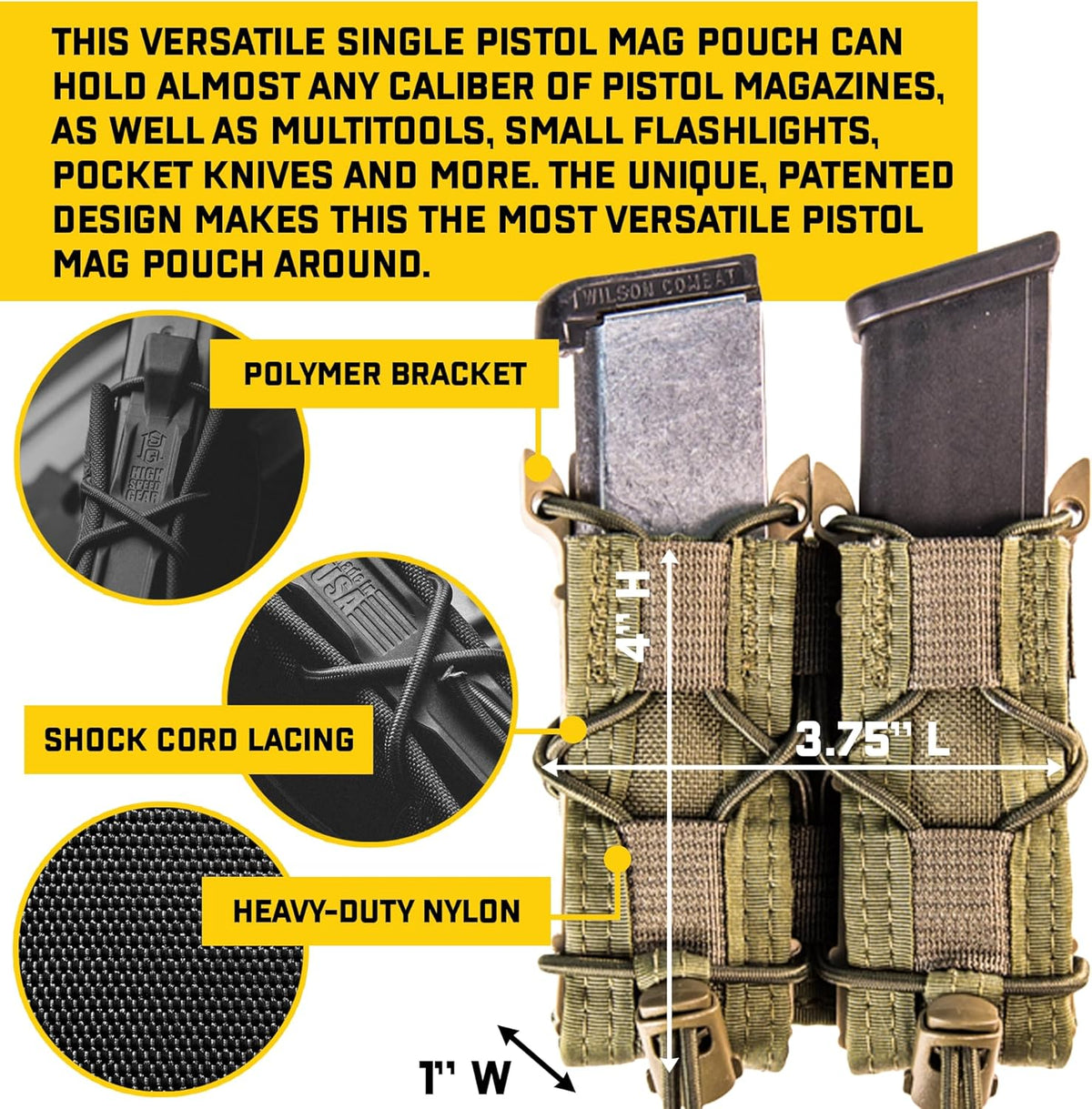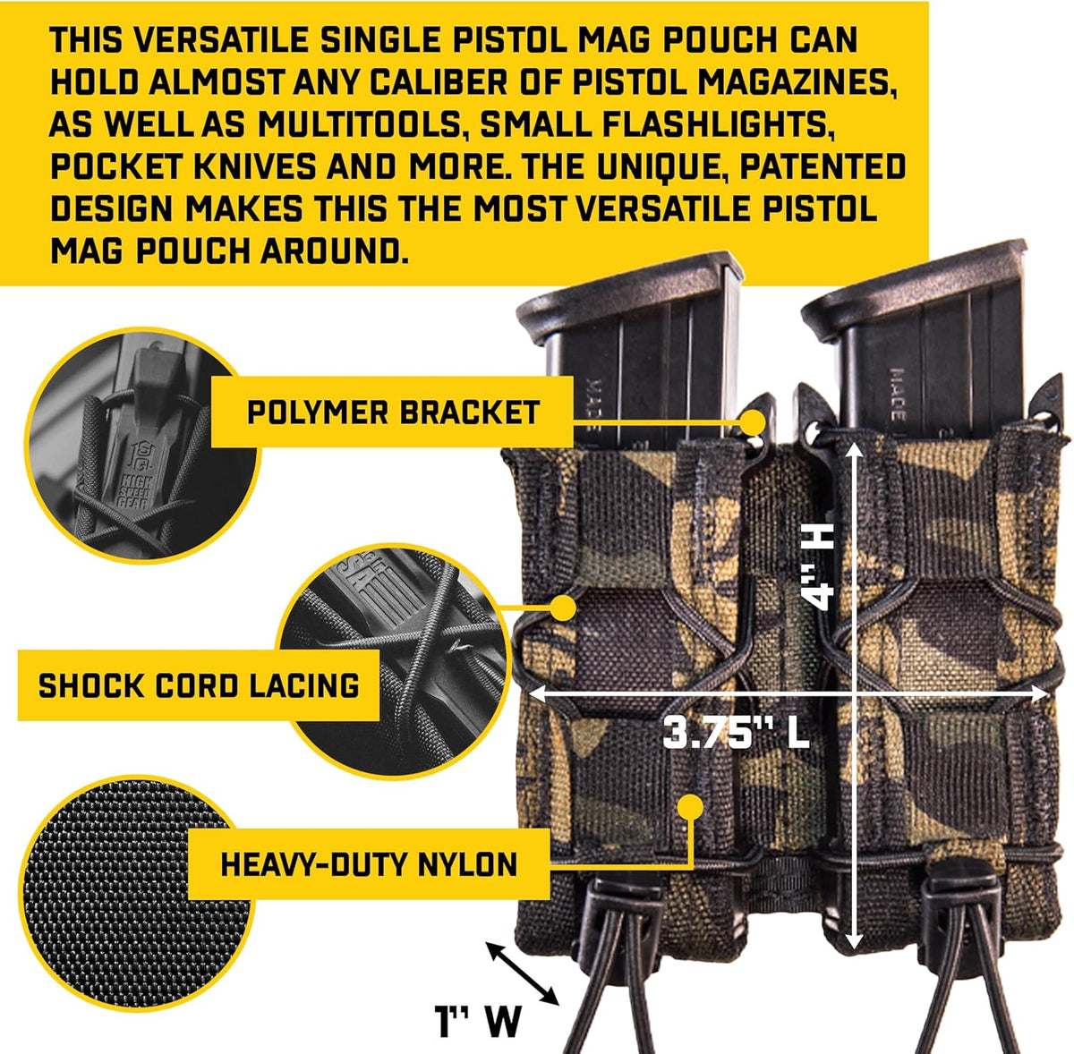 MULTI-FUNCTION – Capable of holding more than just pistol magazines, the HSG Pistol Taco can also hold a variety of multi-tools, knives, and smaller flashlights. Adjustable tension allows you to securely hold your accessories of choice, while maintaining the rapid response ability High Speed Gear products are known for.