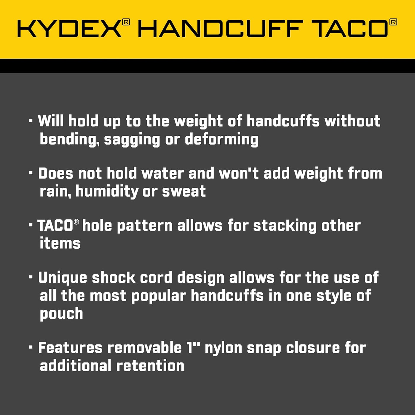 VERSATILE: This handcuff pouch accommodates most chained and hinged handcuffs thanks to its unique design with a shock cord. The weather-resistant Kydex design doesn’t hold or retain moisture, including rain, sweat, and other liquids.